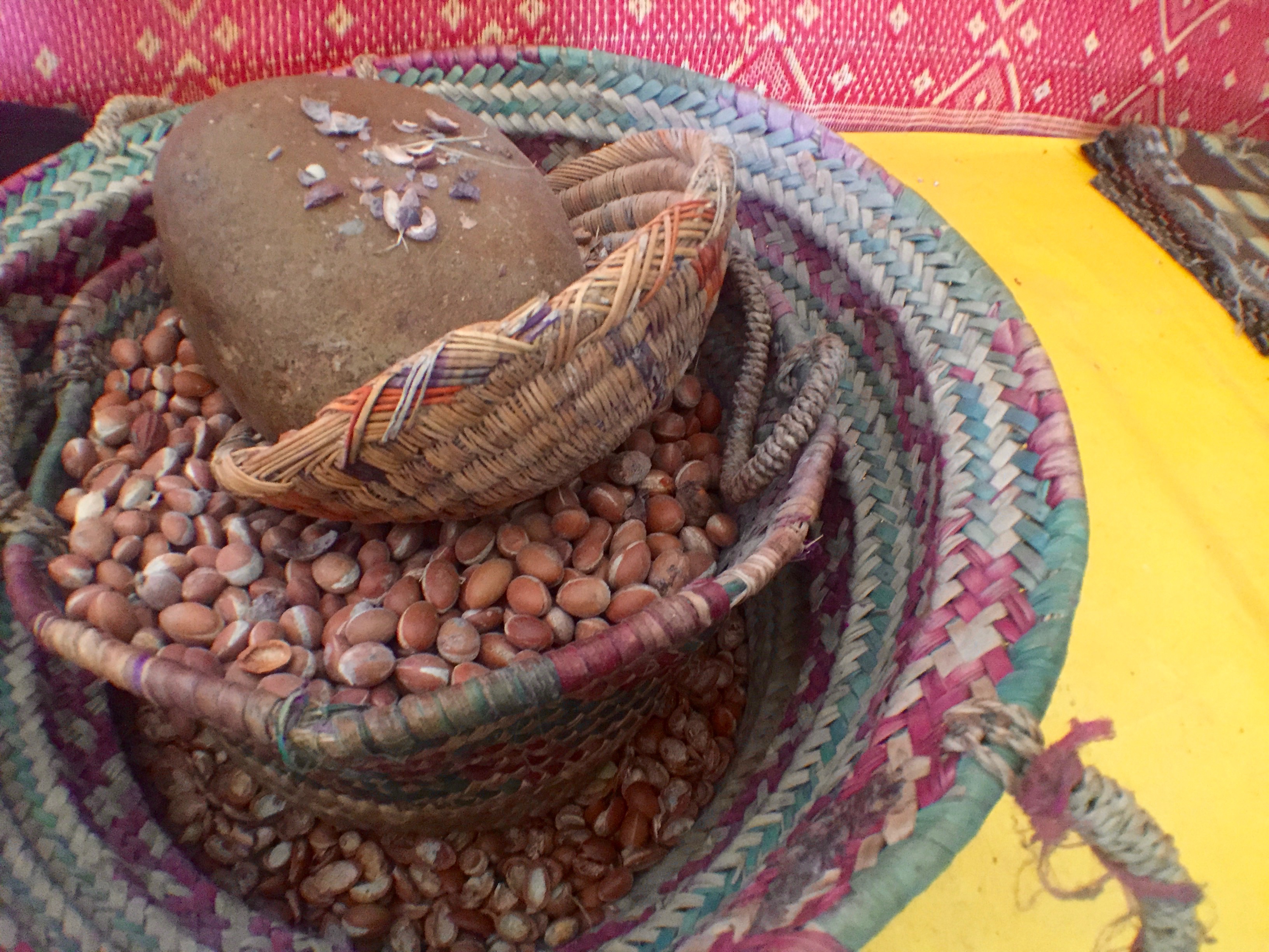 So this tree (I have no picture of this tree… I know, right?) produces a fruit and from this fruit comes the oil. However, getting the oil is no easy task. And on our way to Essaouira we drove through the Argan forest of trees; the biggest and oldest one in the world. We stopped at an all woman’s cooperative that produces this oil; the women who work here are either divorced or widowed. According to Issam, my knowledgeable and friendly guide from Moroccan Gates, this cooperative has the purest Argan oil on the planet. So of course I bought some for a song and a couple of other products that make my skin feel soft and my hair super shiny. It has transformed my fried blonde ends and essentially given my hair new life. Obsession continues.
